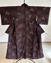深みのある葡萄色を基調に、柔らかな格子地模様の上に蔓草文様が可愛い単衣の小紋です。
