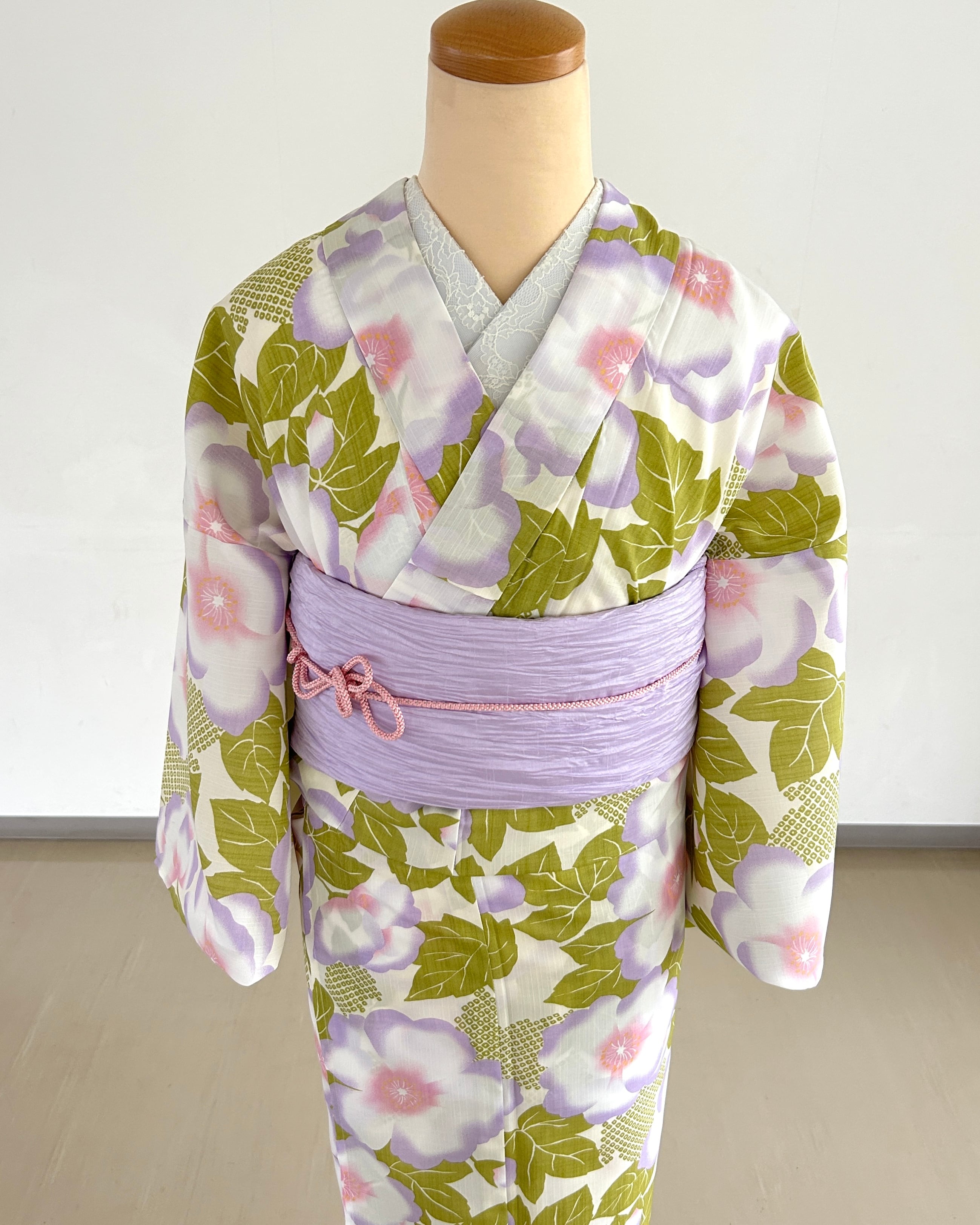 柔らかな白地に、淡いピンクと薄紫の芙蓉(ふよう)をあしらった上品なデザイン。瑞々しい黄緑の葉がアクセントになり、清涼感も。優しい色味が大人の女性にぴったりです。