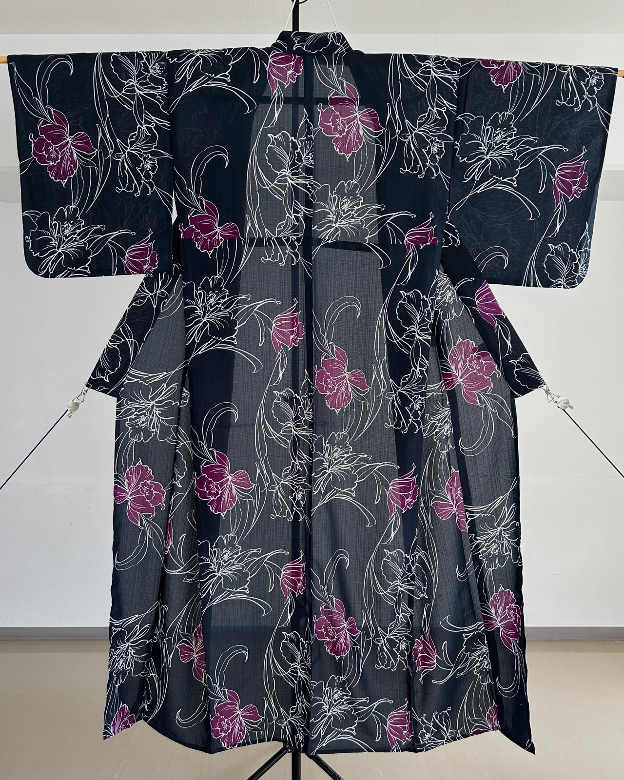深い藍色の地に、白いラインで描かれた百合の花が咲き誇る、大人の洗練されたデザイン。ところどころに配された赤紫の花がアクセントとなり、モダンで上品な印象に。浴衣として一枚での着用はもちろん、襦袢をつけて着物っぽく着ていただいても素敵です。