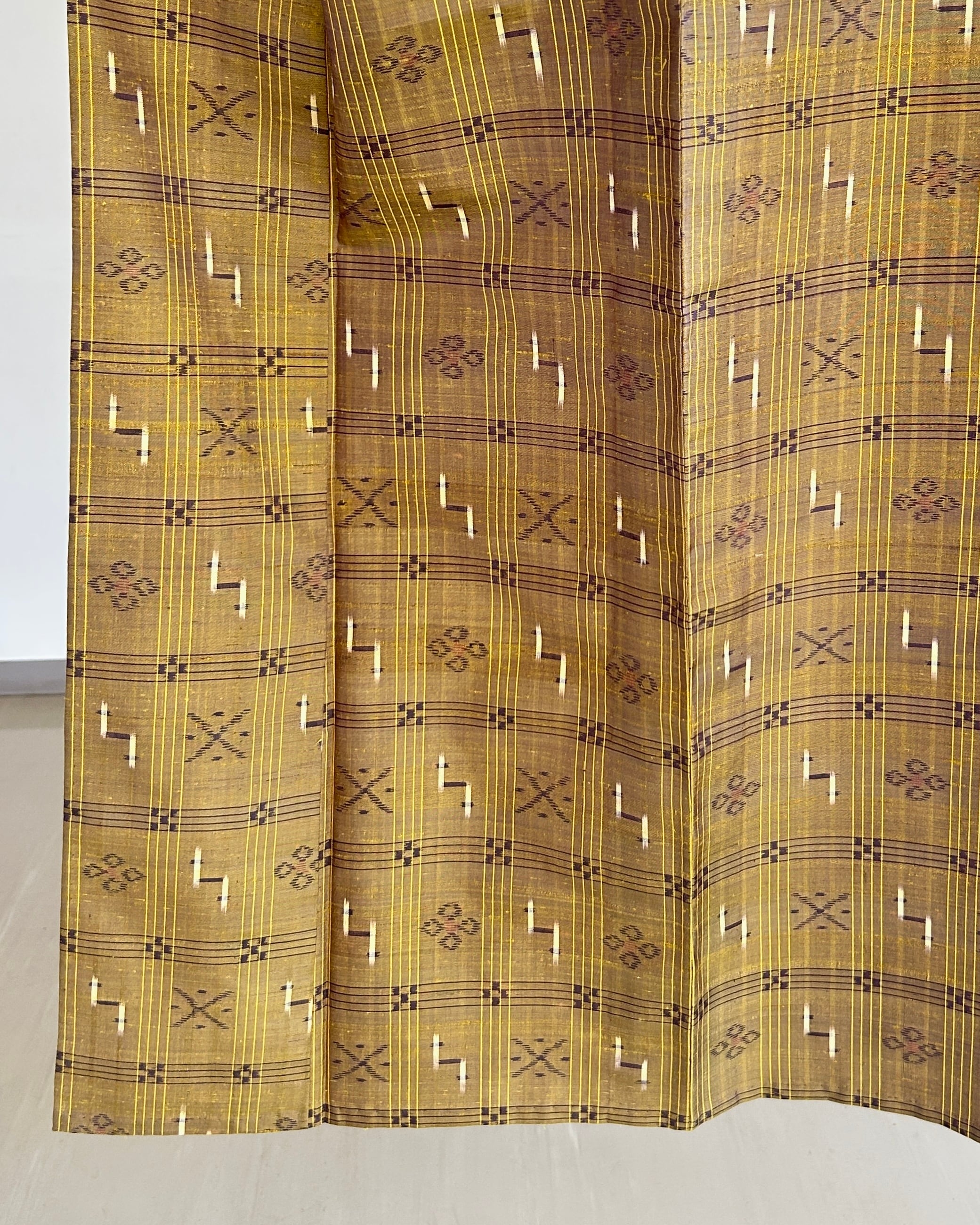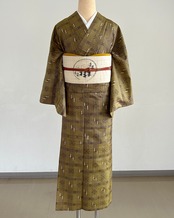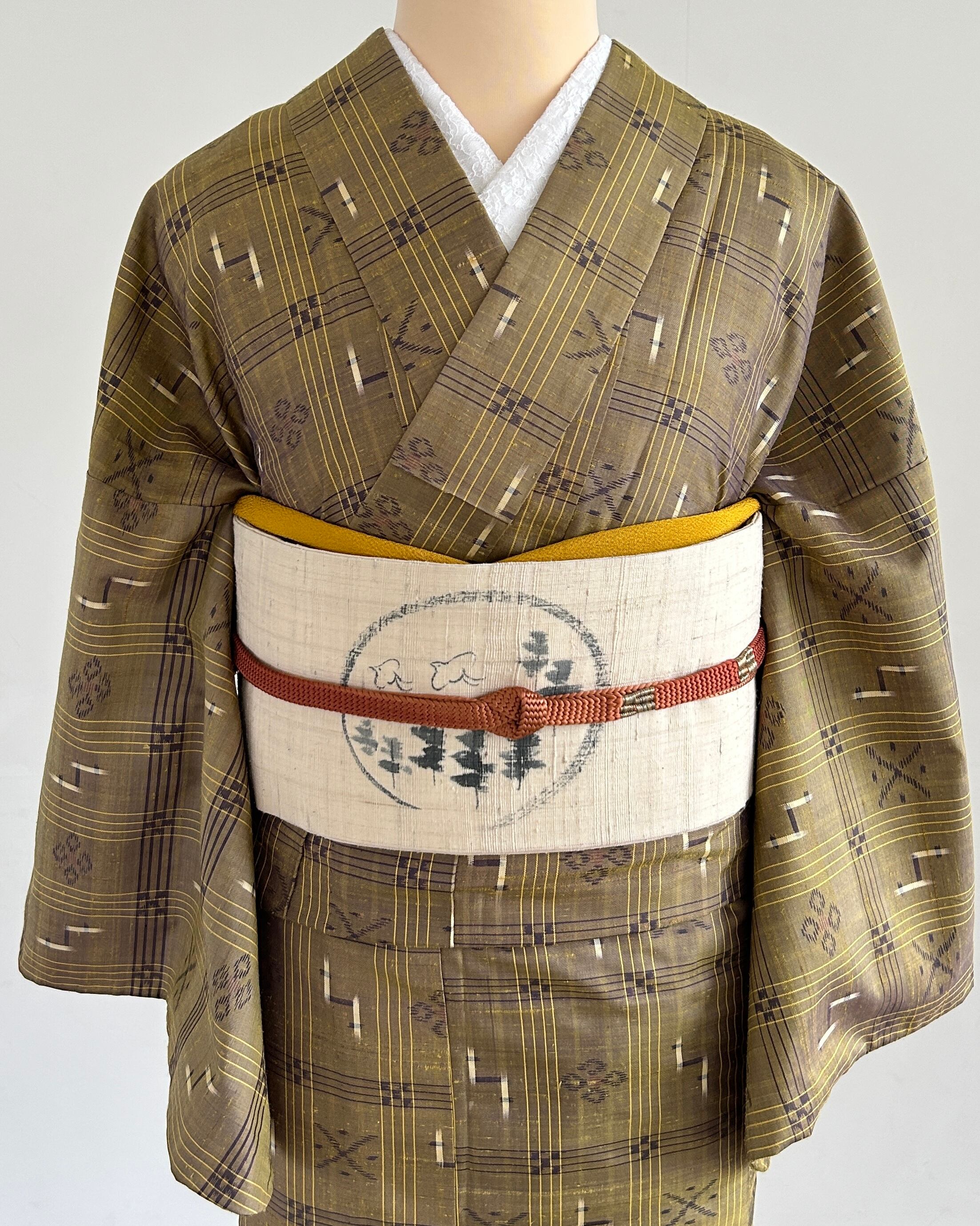 落ち着いた辛子色に、素朴な絣模様が優しく映える単衣の紬。