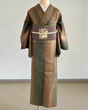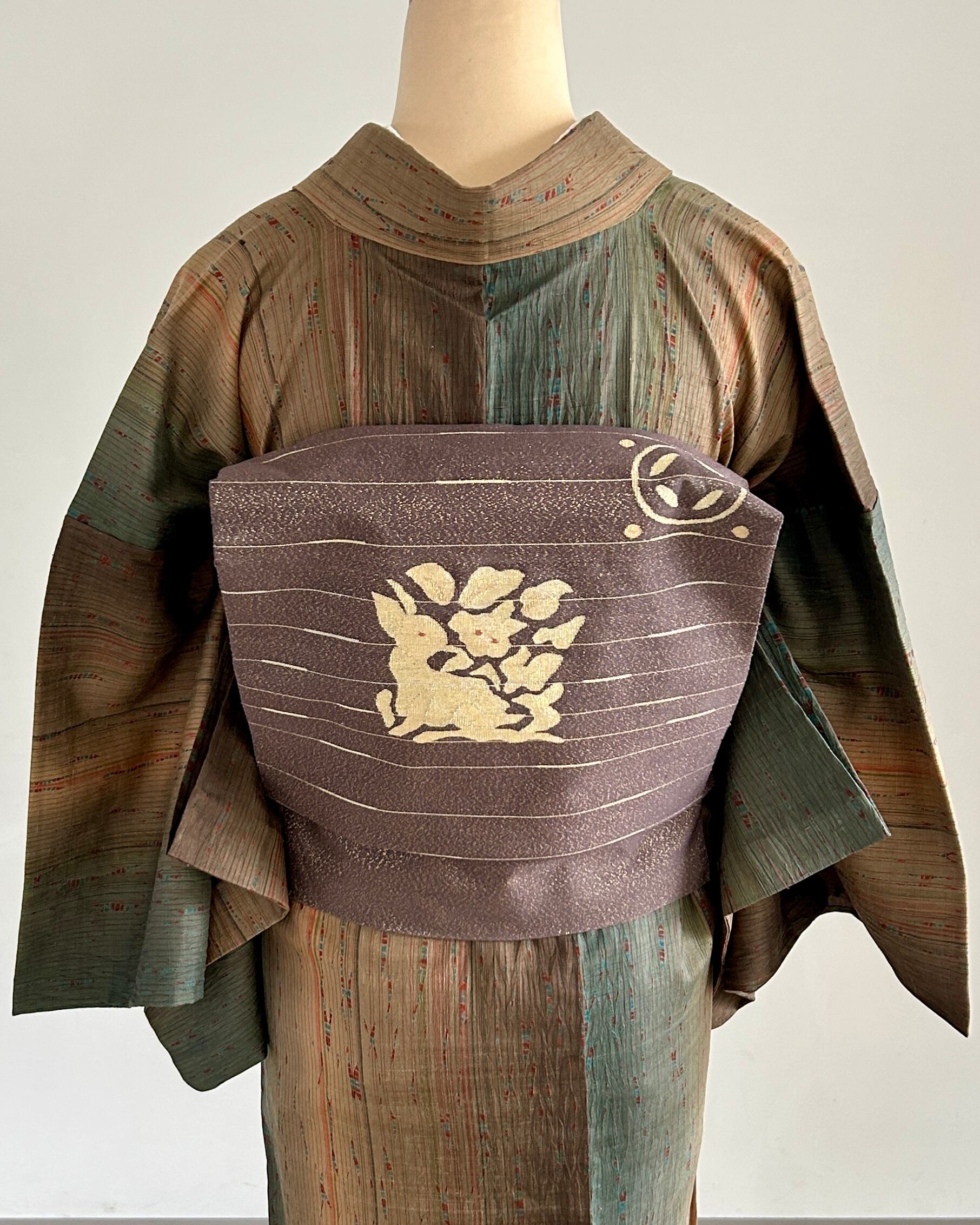 しとやかな茶の地に、金のラメ糸が流れるように織り出されたつづれ風の帯。