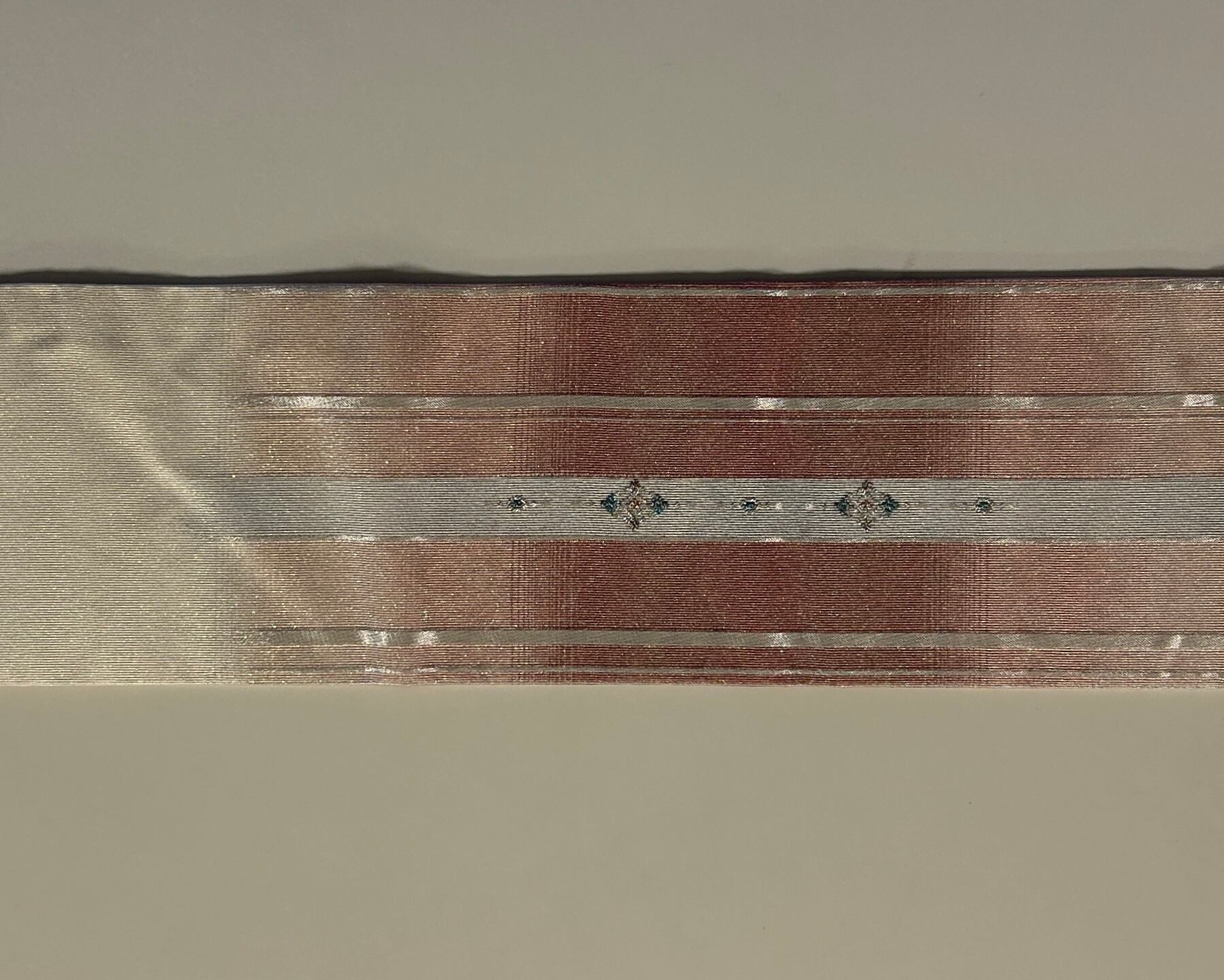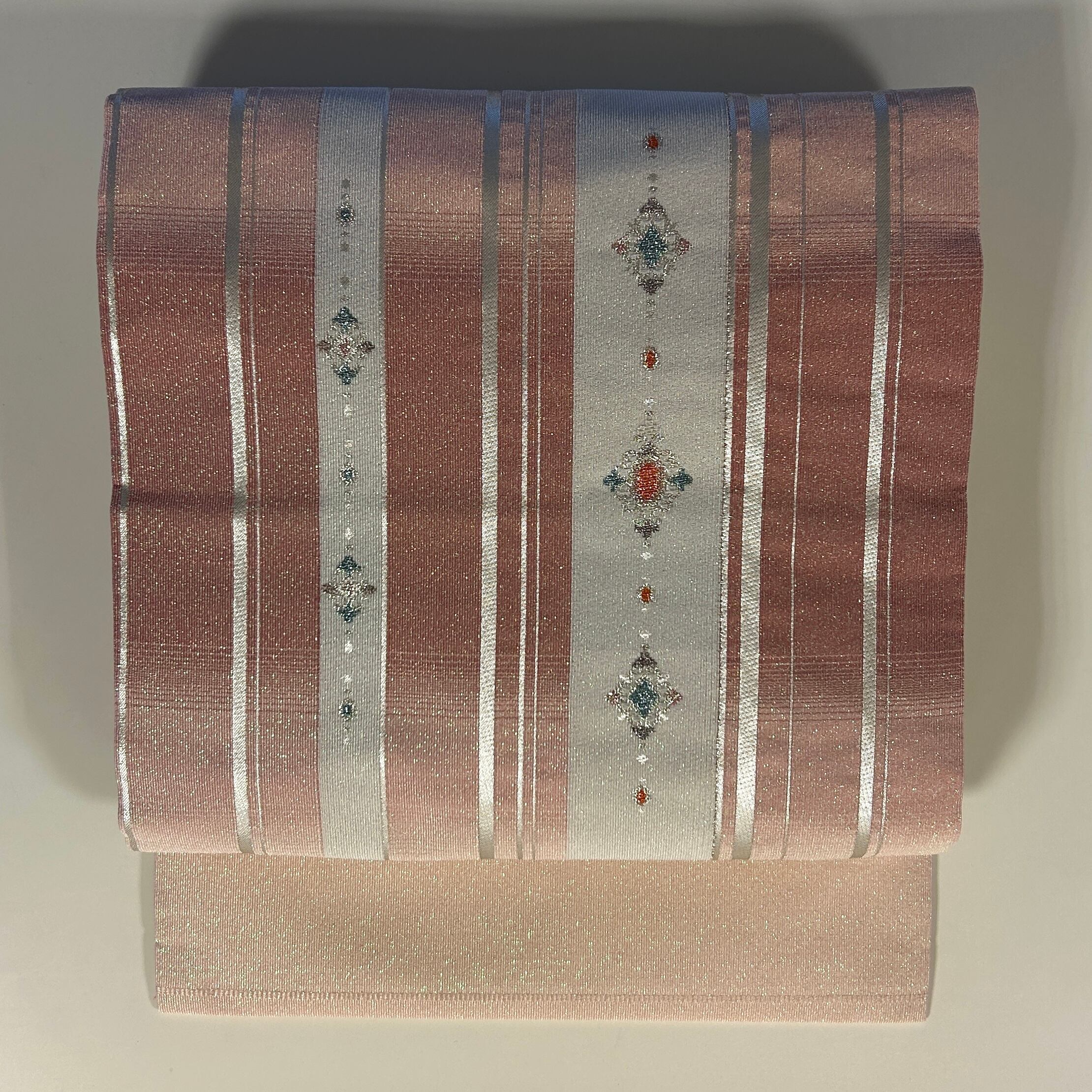 やわらかなベビーピンクに、銀糸がほのかにきらめく上品な名古屋帯です。