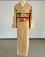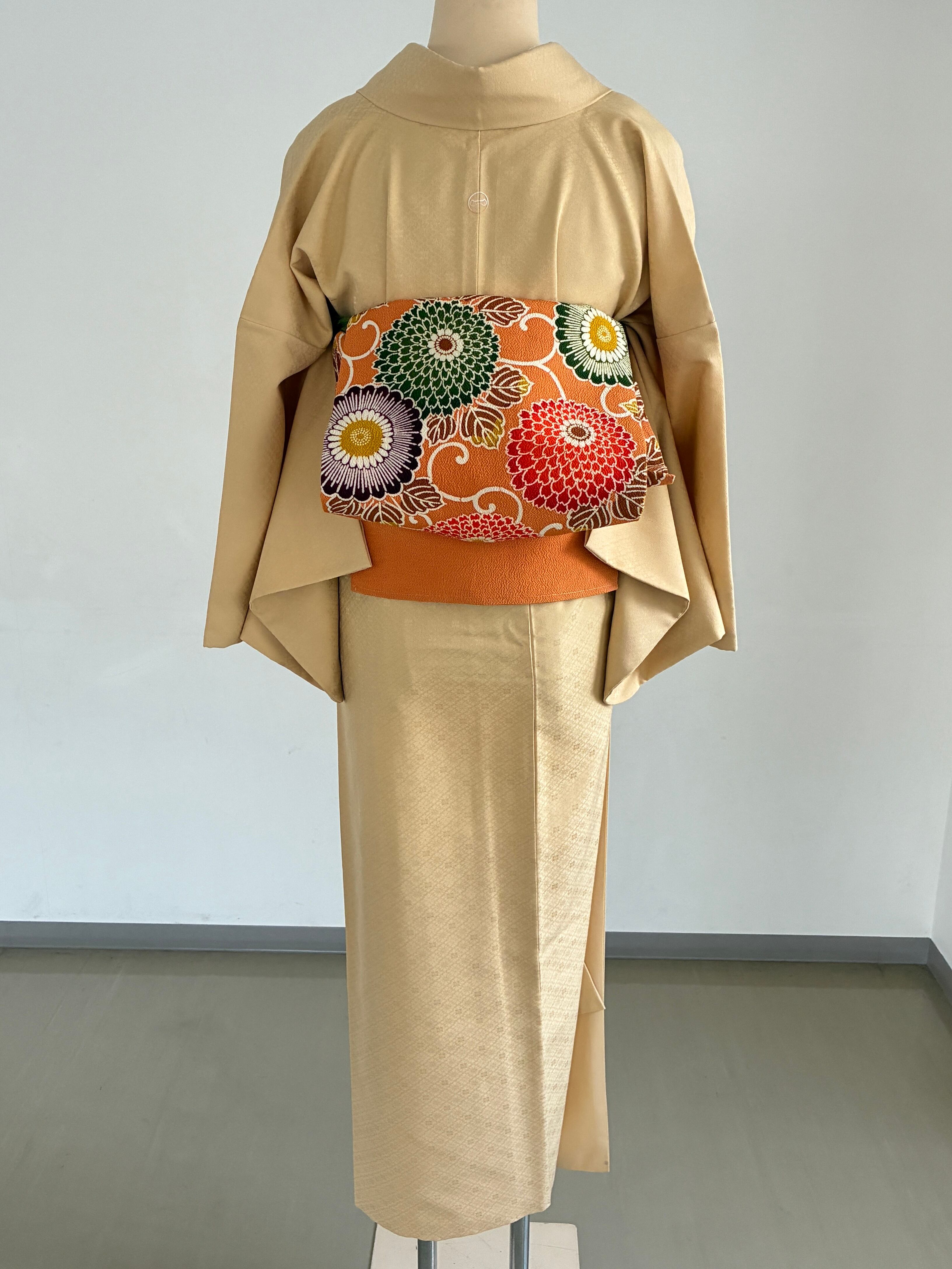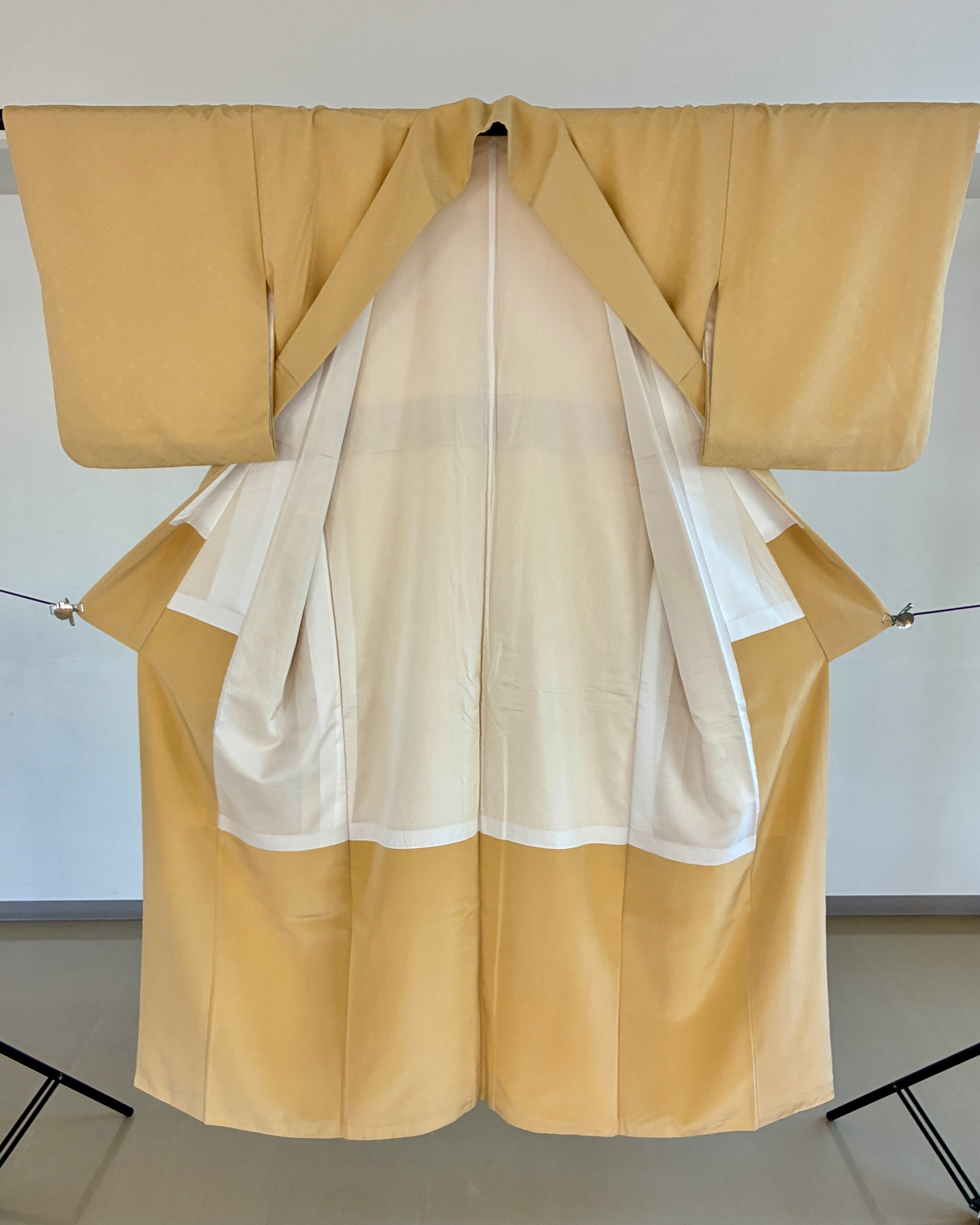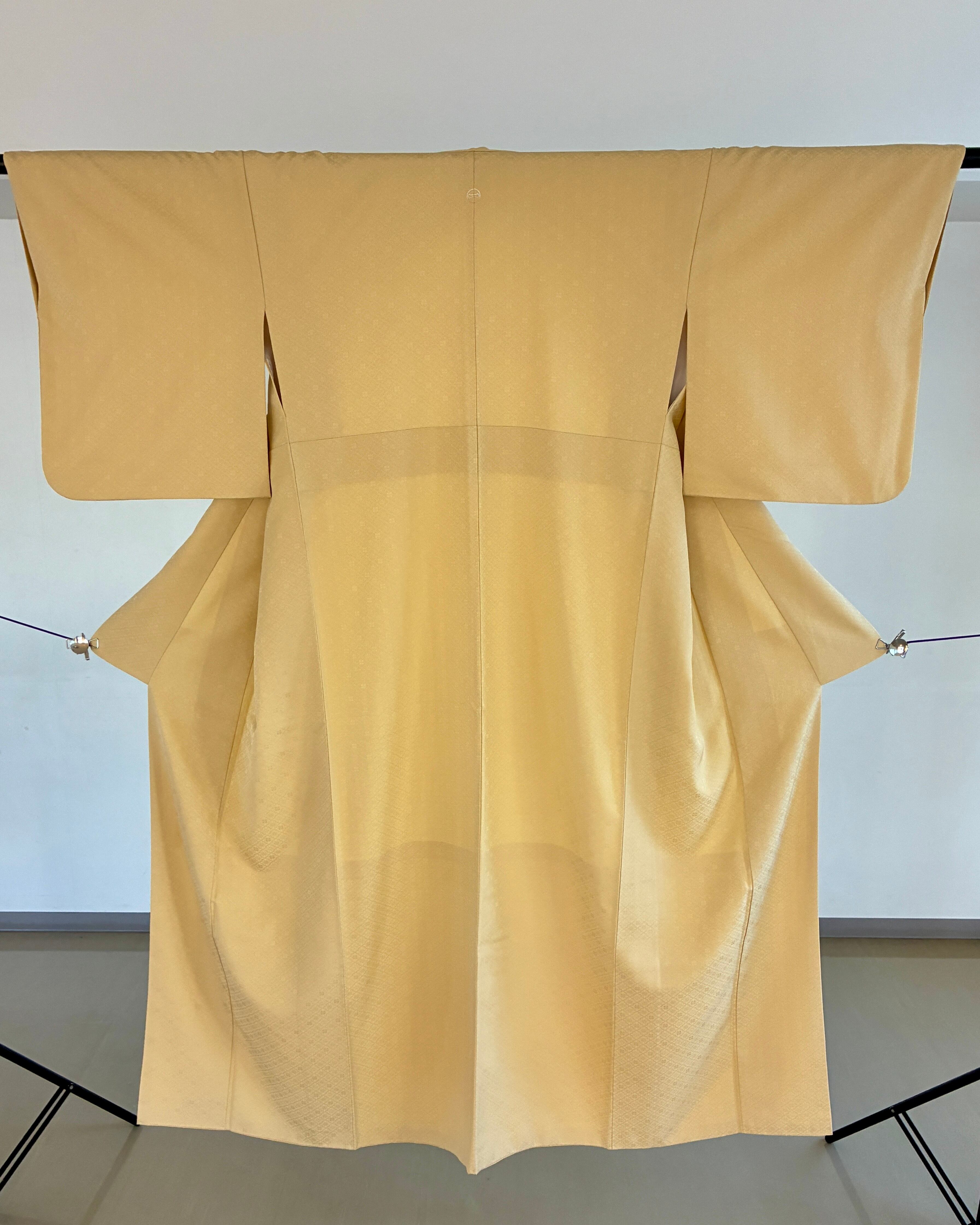 やわらかなクリーム色に、菱柄の地模様が静かに浮かぶ色無地です。