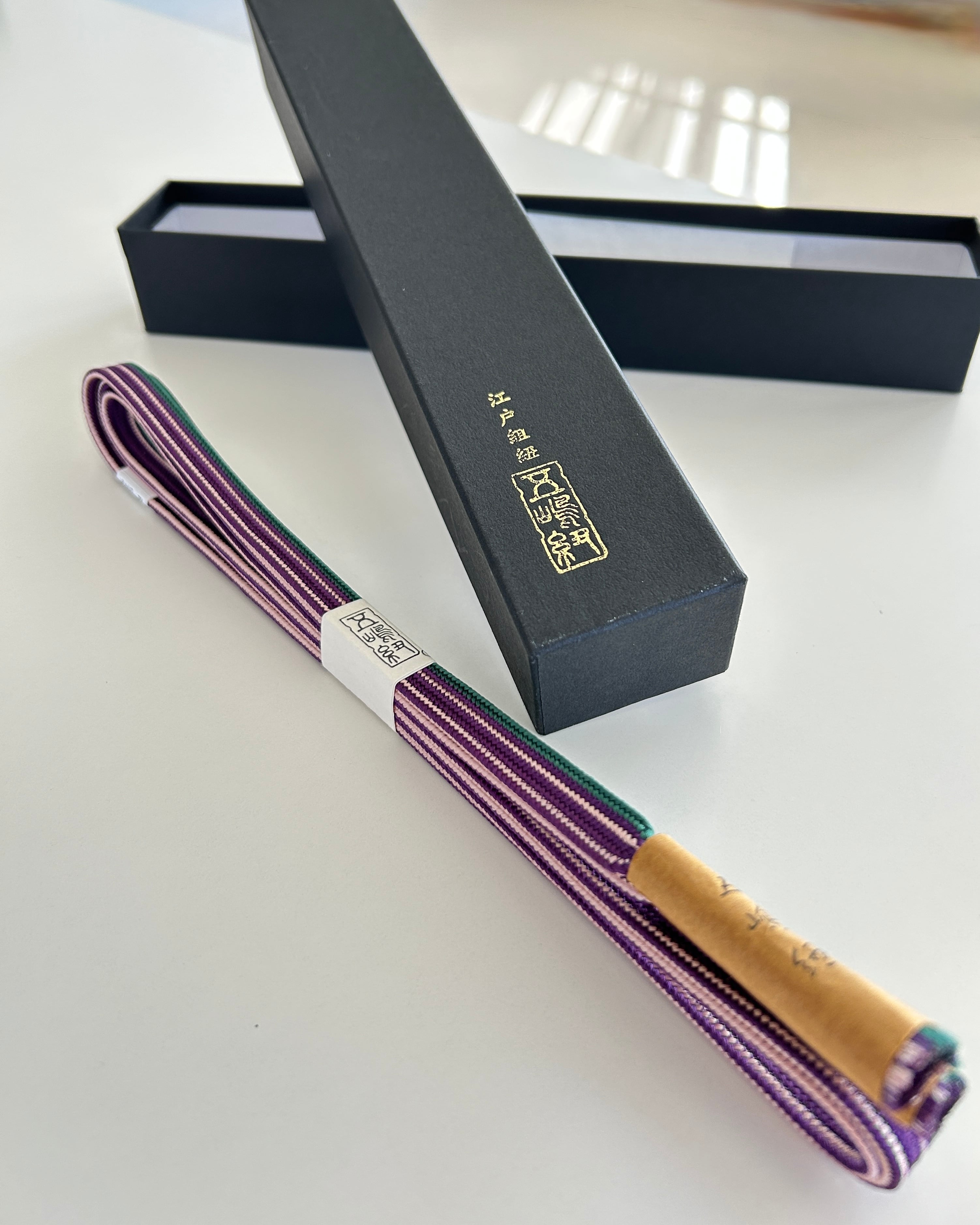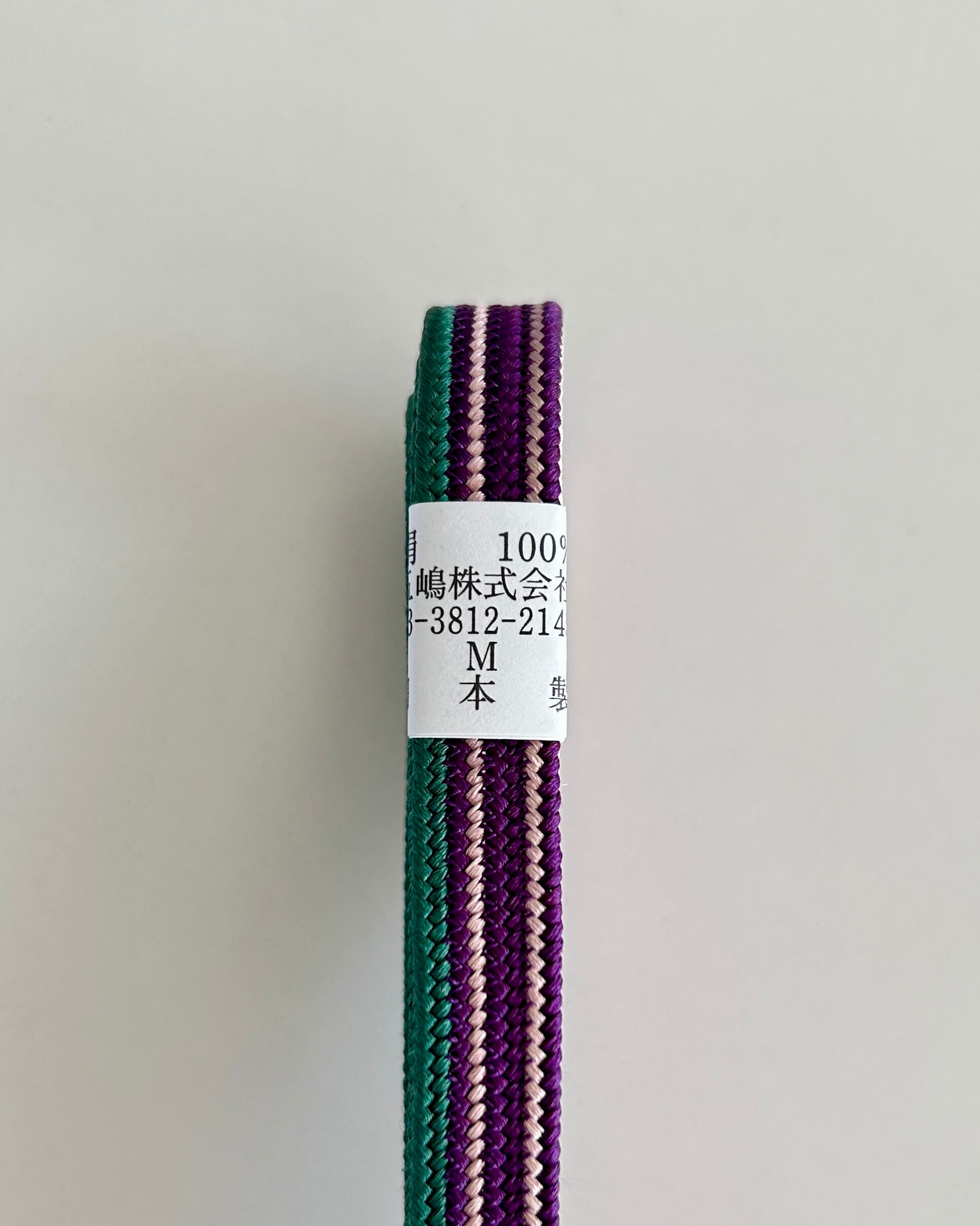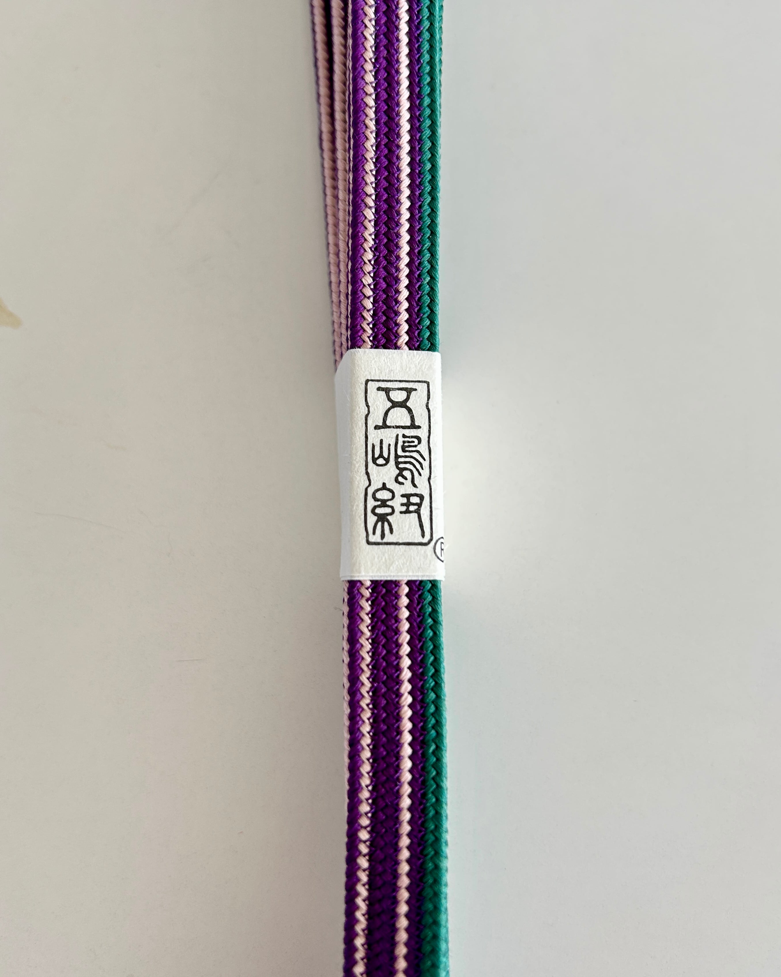 紫を基調に、緑と淡色が織り込まれた華やかで品のある配色が魅力の平組帯締め。
