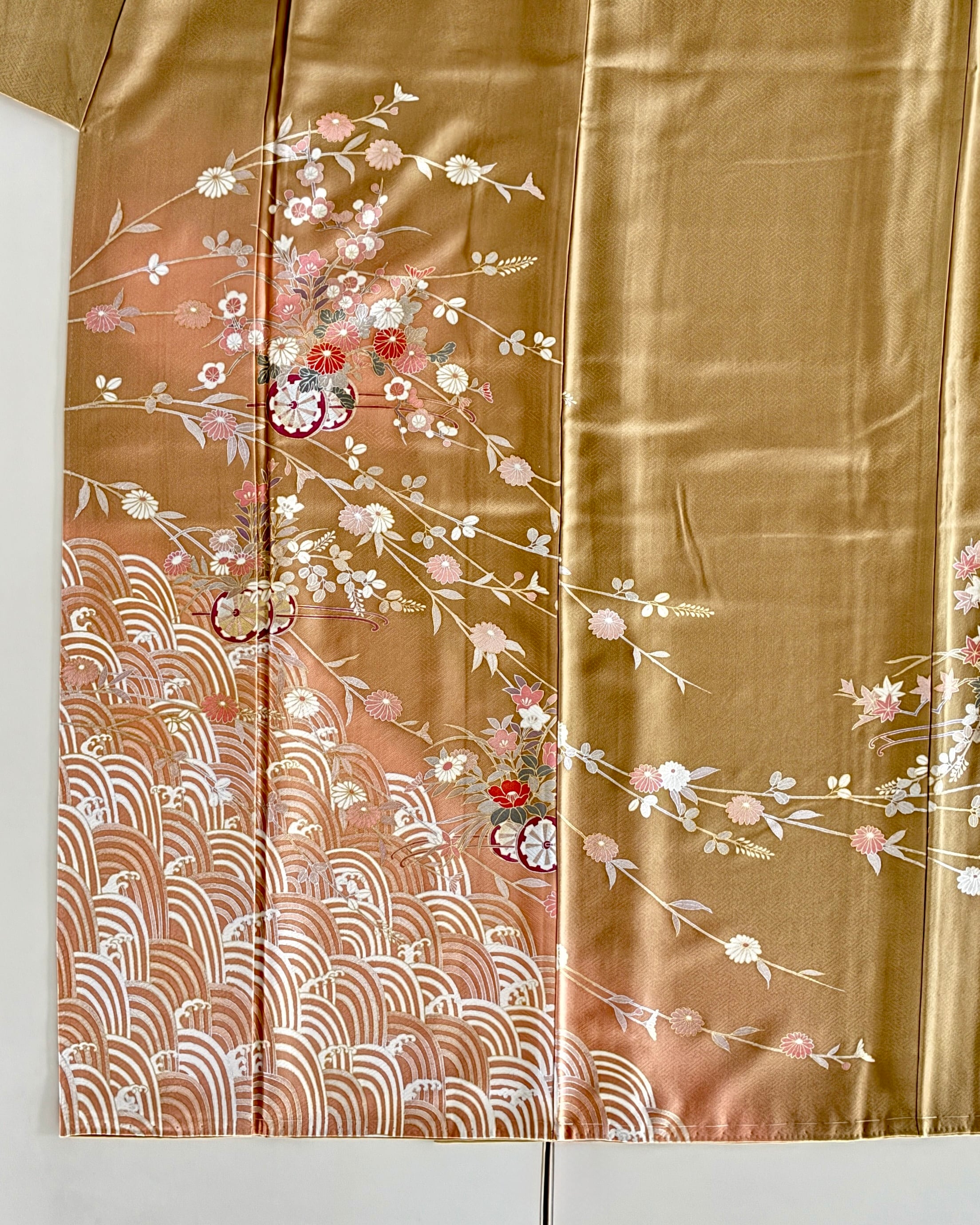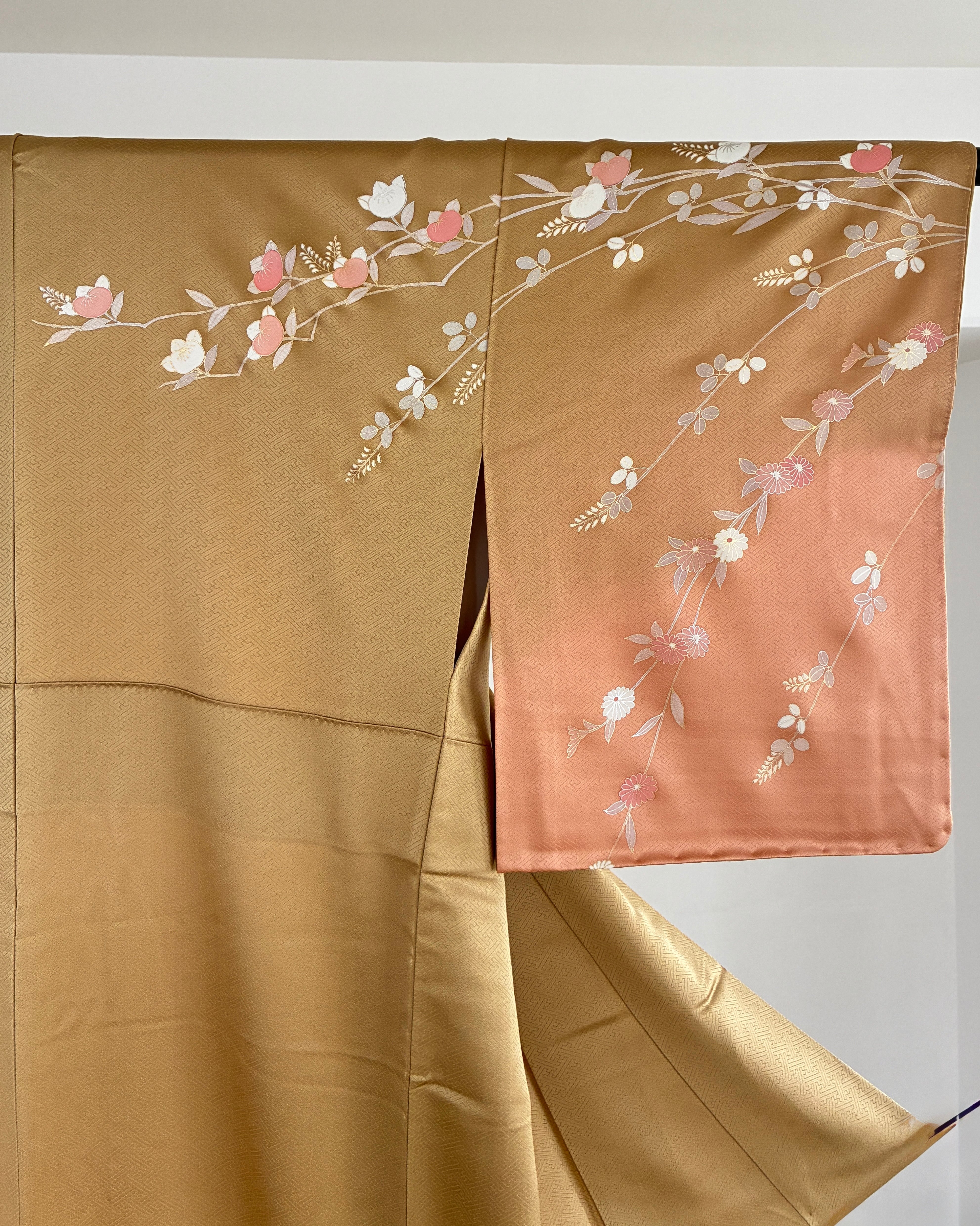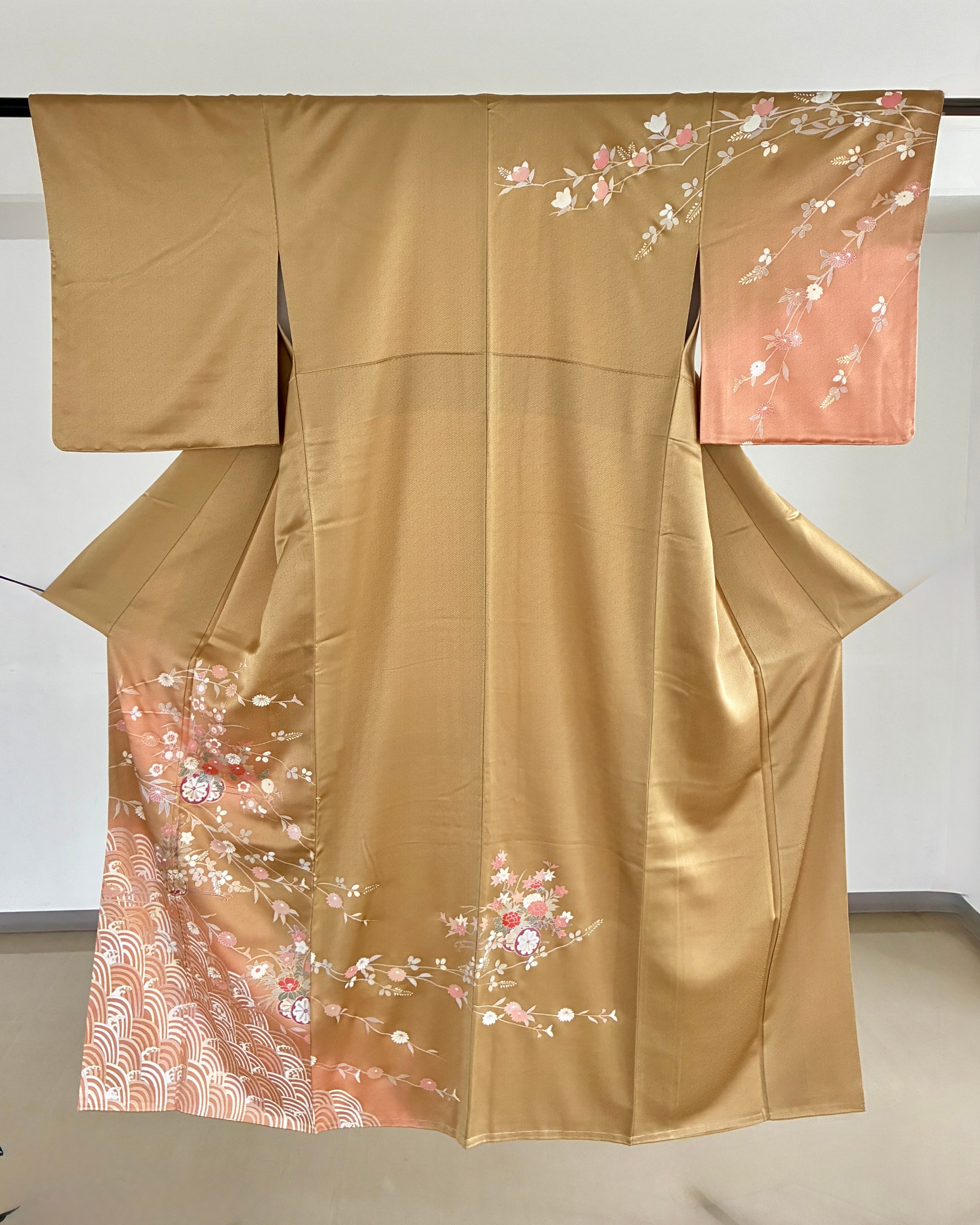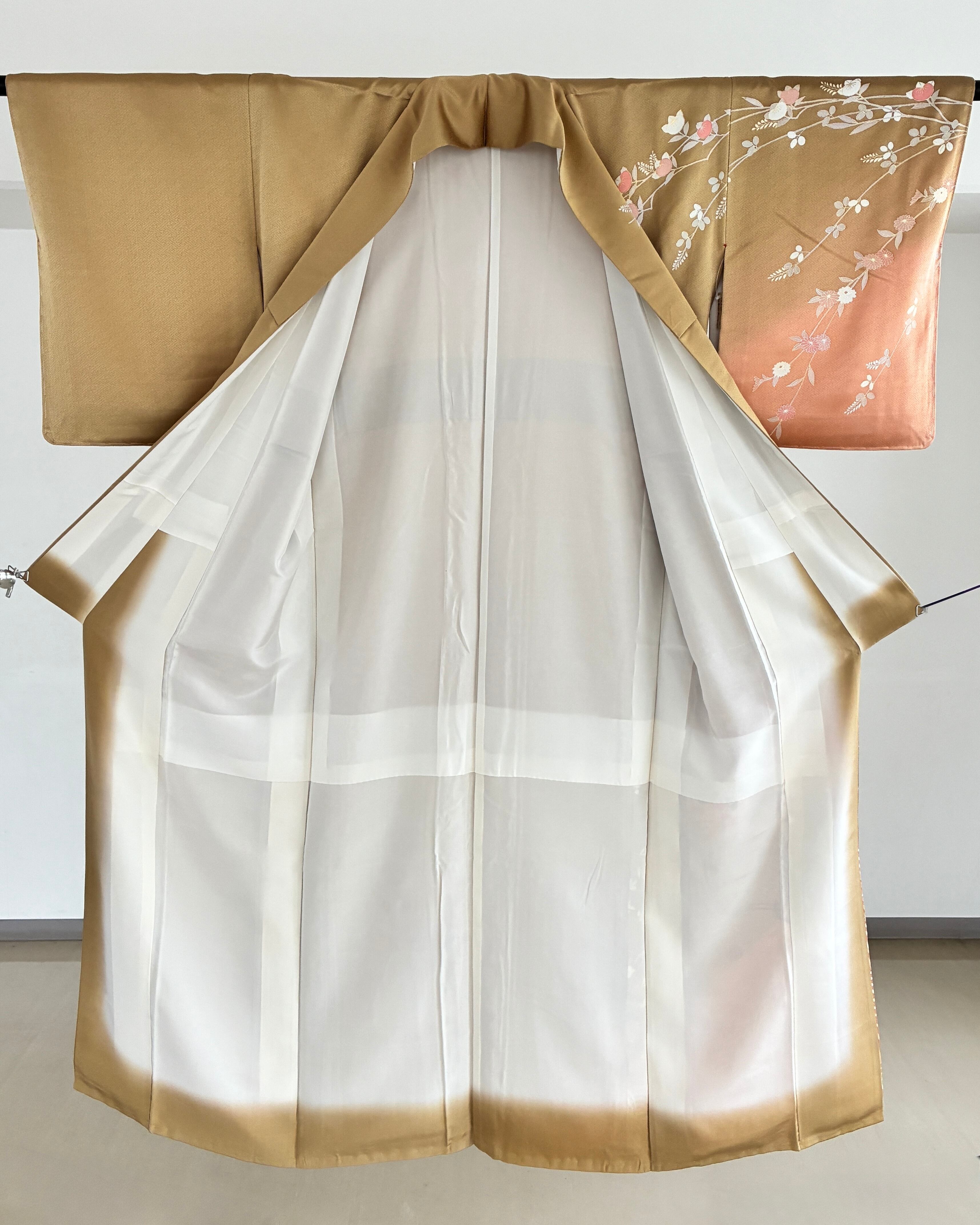 上品な金茶地に、やわらかな珊瑚色のぼかしが美しく映える袷の訪問着です。