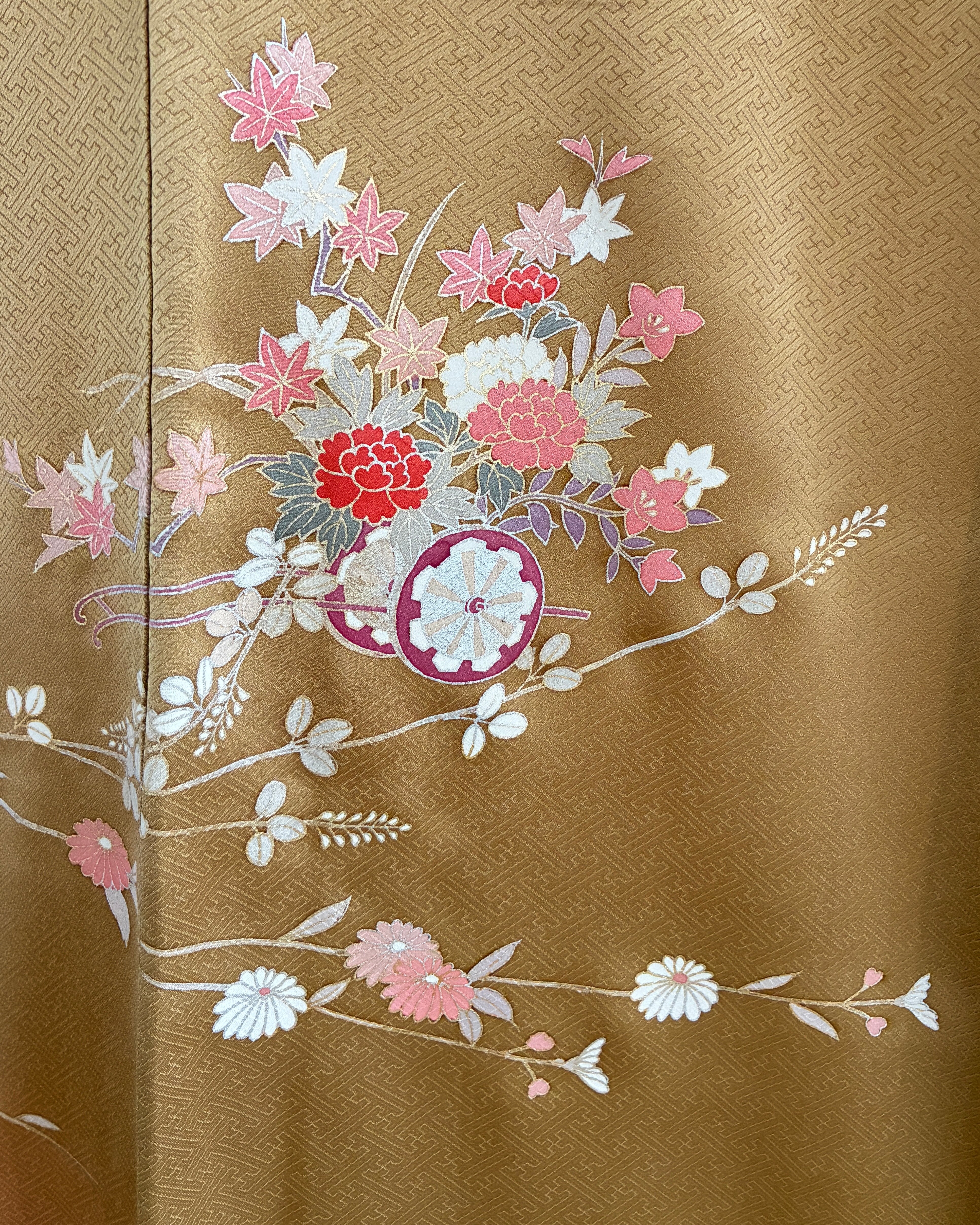 その上に四季の花々が流れるように配され、華やかさと格調を兼ね備えた一枚に仕上がっています。