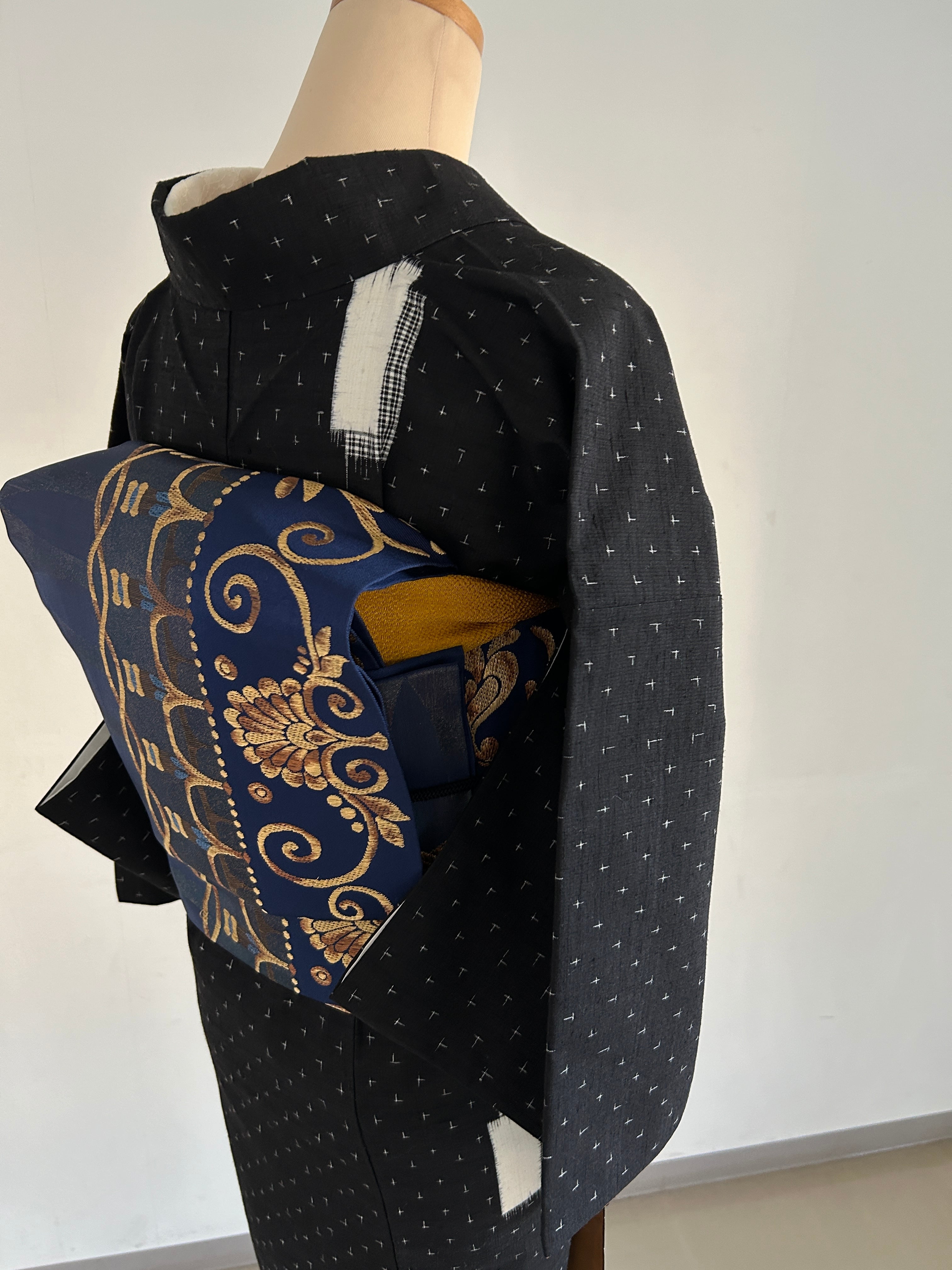 黒地にキリっと白の抜き模様が映える「袷 絣 紬」は、変わり十字絣の洗練されたデザインが際立つ一品です。素朴になりがちな黒地の十字絣が、白抜きの模様によって、温かみの中にモダンな印象を感じさせてくれます。カジュアルな日常使いに合わせて、モダンにも素朴にも幅広いコーディネートをお楽しみいただけます。
